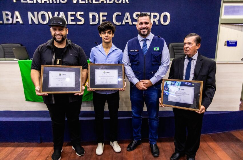 O vereador Leonardo Dias (PL) presidiu, na manhã desta sexta-feira (17), a Sessão Solene que entregou a Comenda Aldemar Paiva para os jornalistas França Moura e Alysson Moura (in memoriam) e a Comenda Colunista Social Maria Cândida Palmeira para o fotógrafo e digital influencer Flávio Cansanção.